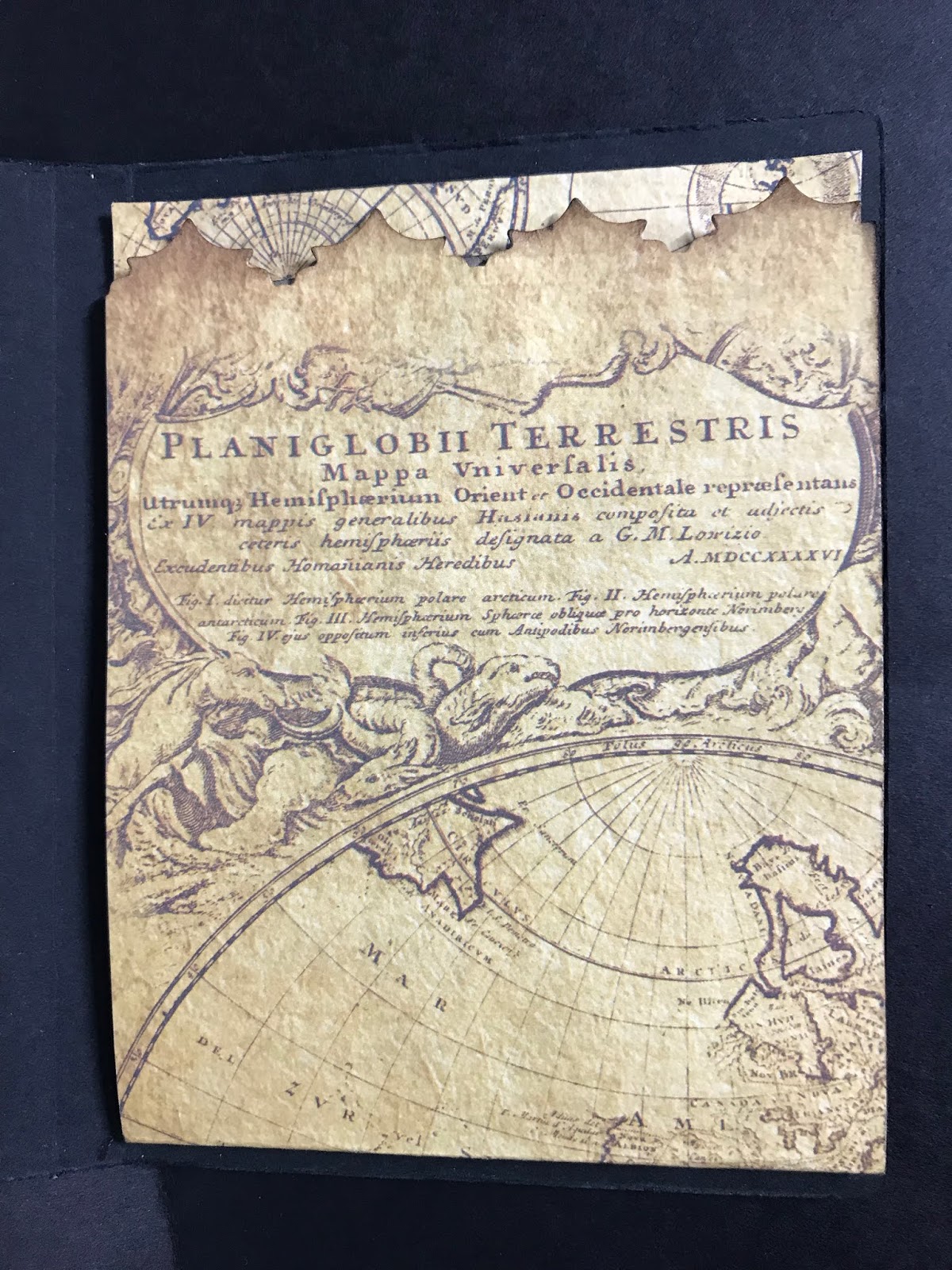 The gold embossing on the globe diecut was a bit too bright, so I knocked it back with some aqua and iron Prima gilding waxes. I then cut a piece of brown ribbon, and affixed that to the cover with a brad. Onto the inside pages!